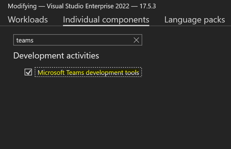 Start by opening the Visual Studio Installer click Modify, Individual components and Search For Teams. This will allow you to install the required toolkit and the Teams templates, the component is called Microsoft Teams Development Tools at the moment.