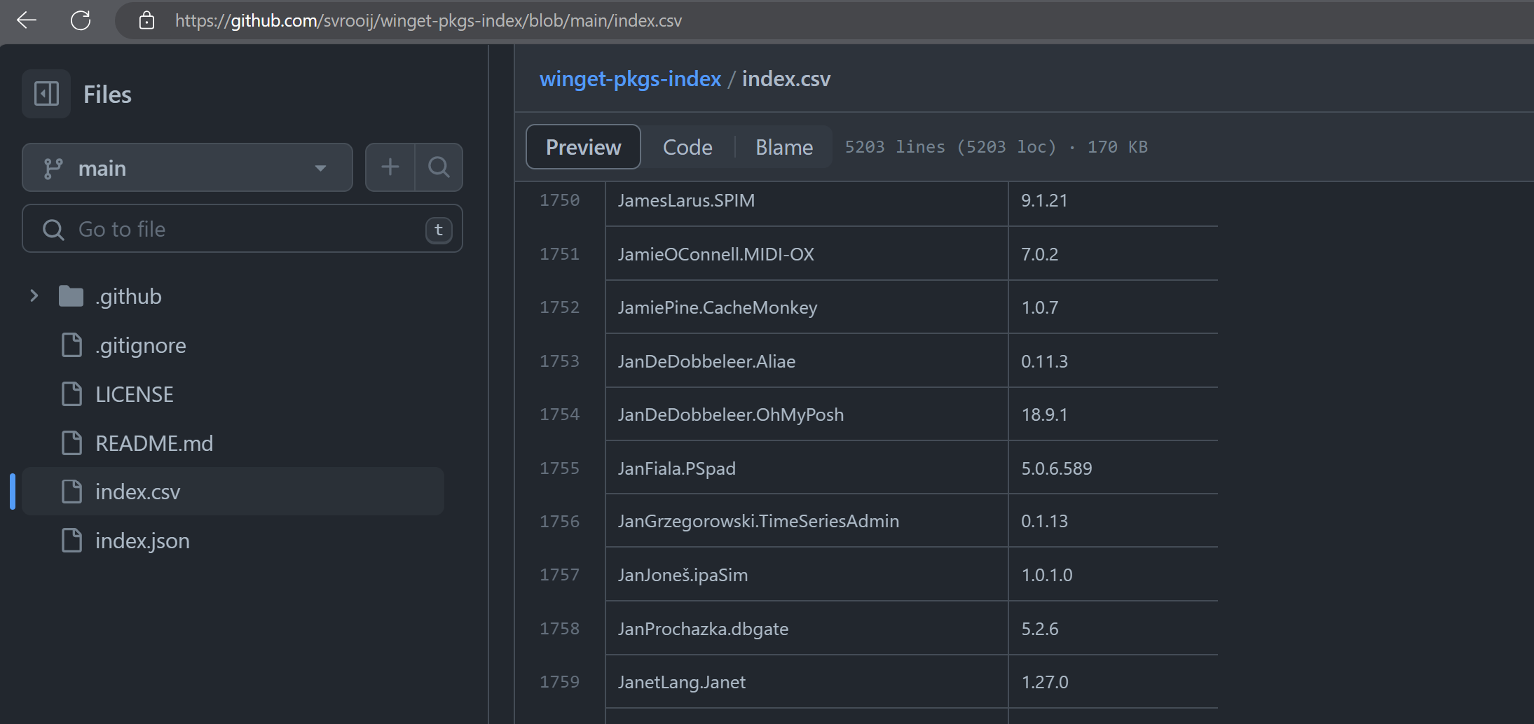The is this repository and a zip disguised as an msix file containing all the manifests. Let’s see if I can make an easy available index of all the packages. If I have the exact package id and the latest version, I can pull the rest of the data from GitHub. So I only need the package ID and the latest version.